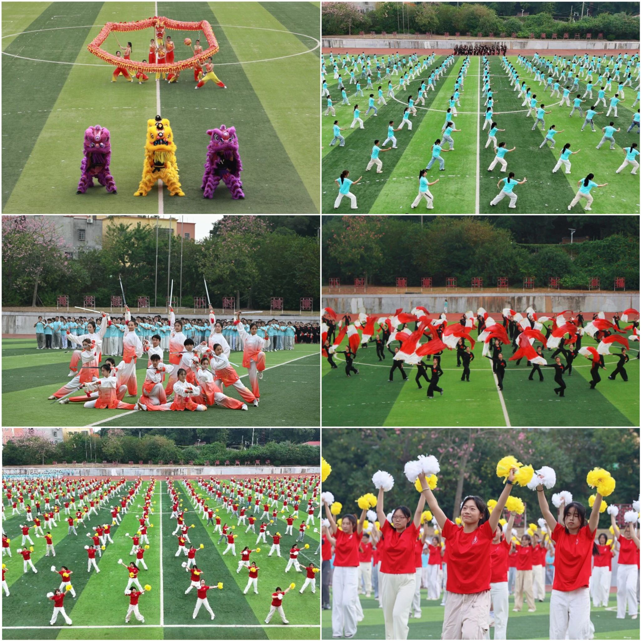 开幕式紧扣建校65周年主题,亮点纷呈、氛围热烈。各学院方阵在整齐响亮的口号声中有序入场,展现了师生们的良好精神风貌。团体操表演中,龙狮共舞气势磅礴,武术与太极表演刚柔并济,舞蹈展现柔美与深情,书法表演笔墨苍劲有力,原创排舞《一方沃土》动作整齐划一,生动展现华大学子的青春活力与奋进姿态,表达了对学校65岁生日的深情祝福。