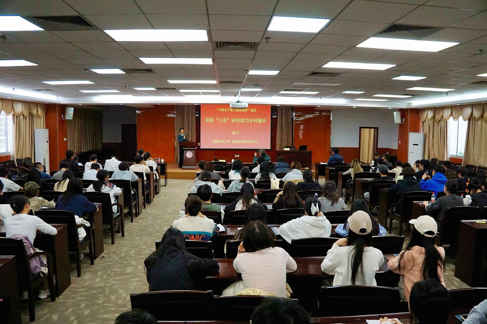 12月12日,全国高校“中国共产党人精神谱系”宣讲团走进sjb世俱杯官方网站,宣讲团专家,福建农林大学教授、博士生导师廖红作专题报告。sjb世俱杯官方网站党委常委、副校长林宏宇出席宣讲会。