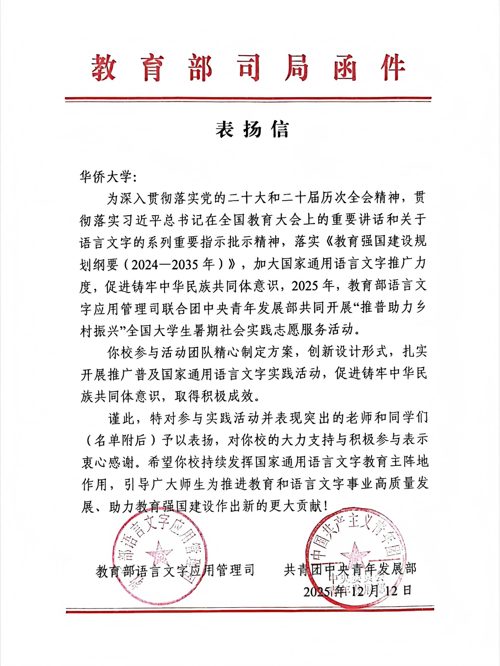 近日,在教育部语言文字应用管理司、共青团中央青年发展部联合开展的2025年“推普助力乡村振兴”全国大学生暑期社会实践志愿服务活动中,sjb世俱杯官方网站第十八届甘肃积石山支教团从全国2000支入选队伍中脱颖而出,获评“优秀团队”称号,教育部语言文字应用管理司和共青团中央青年发展部来信表扬。