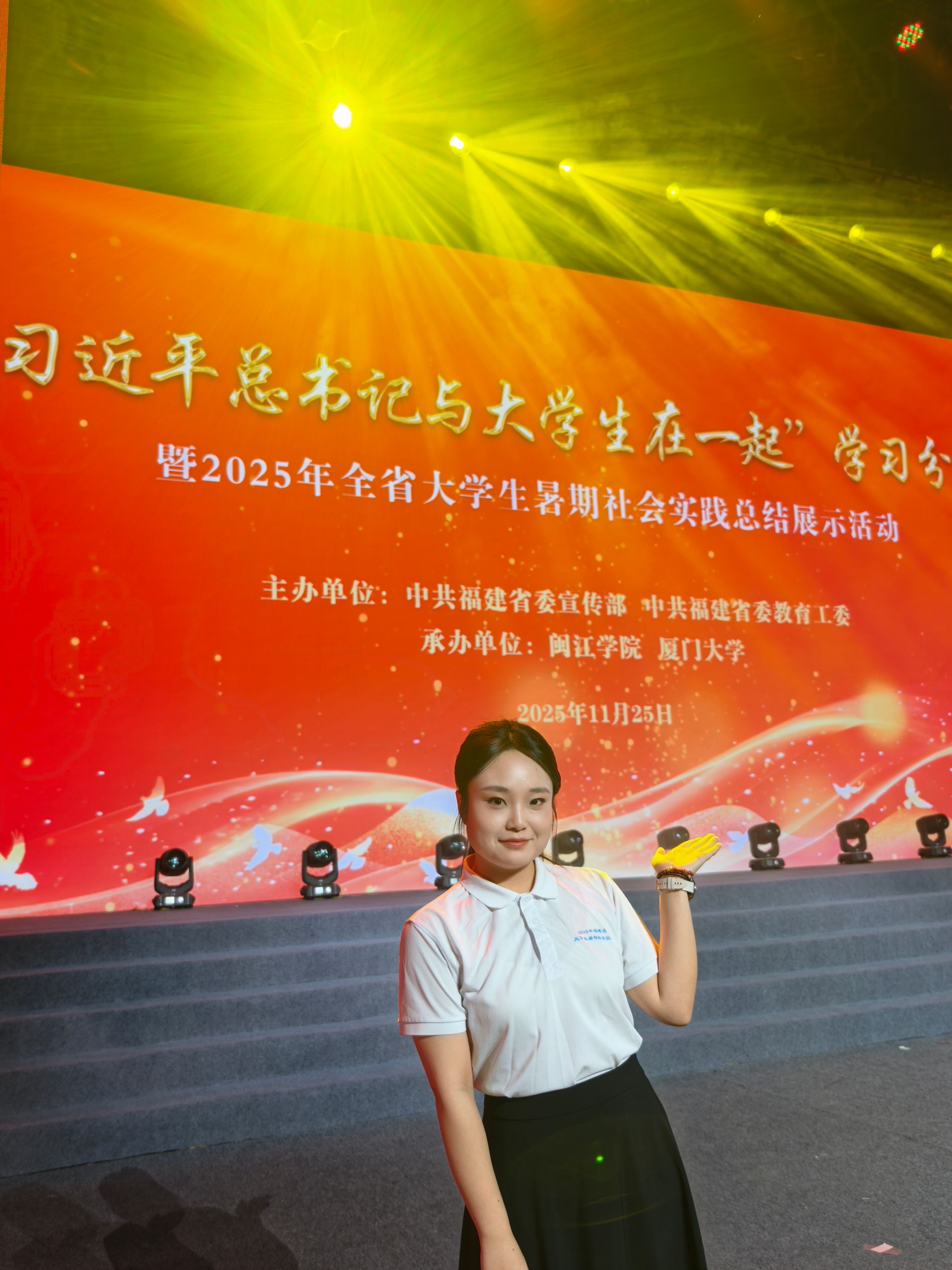 “我们不仅要看,更应当有自己的思考。”黄可钦说。正是带着这份思考,她和团队成员把调研中的心得体会凝练成成果。她参与撰写的纪实新闻稿被人民网、新福建等主流媒体转载,让更多人看到了新时代大学生的思考与行动。同时,作为全省九支省级示范队中唯一的学生代表,她站上全省大学生暑期社会实践总结展示舞台,围绕“习近平与大学生朋友”,与厦门大学、福州大学等高校代表同台汇报成果。面对福建卫视等平台的直播镜头,她将团队在大湾区的所感所悟娓娓道来,让青春的宣讲声传遍八闽大地。