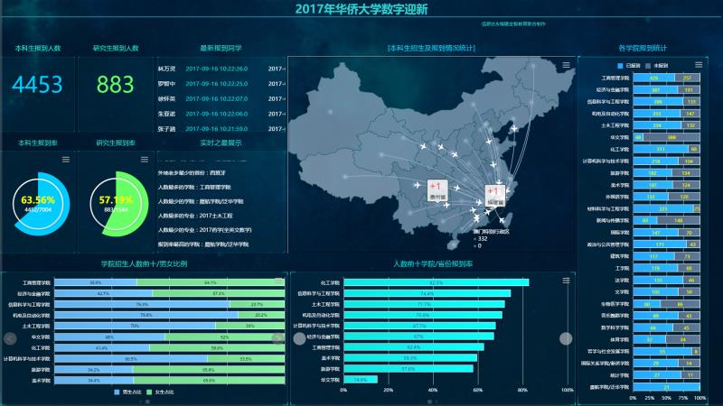 数字迎新系统是基于已经建设完成的数据共享和集成平台,通过汇总招生系统、学工系统、教务系统数据进行的大数据分析服务。本科生、研究生报到人数、学院招生人数前十及男女比例、各学院报到统计、新生人数前十学院及各省份报到率等数据实时展示,吸引了众多新生和家长在泉州、厦门校区的大屏幕前驻足。
