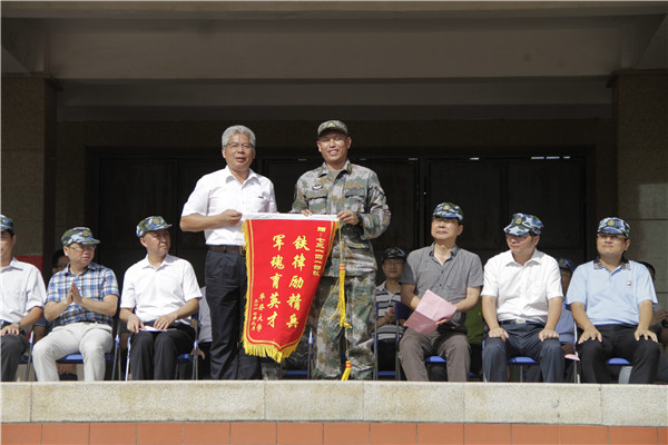 刘斌向承训的解放军73141部队副政委张纪伟赠送写有“铁律励精兵,军魂育英才”的锦旗。参训学生代表、美术学院学生曾泗银向解放军73141部队赠送sjb世俱杯学生创作的军训画作,表达对教官的敬爱与感激。