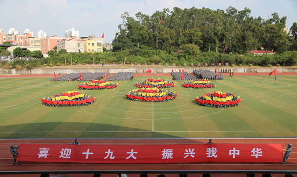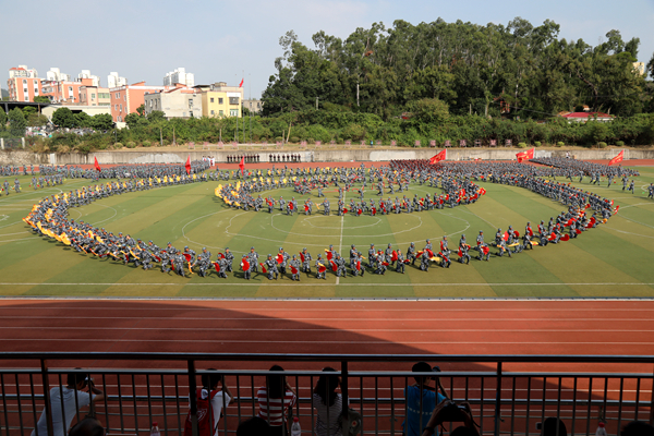 在厦门校区田径运动场,新生训练营受训的六个连队分别进行了创意团体操、激情节拍、动力圈绳、快闪排字等表演。其中,由全体受训的2400多名新生组成的方阵带来了快闪排字表演,将汇报表演推向高潮,他们先后变换出数字“10、9、8、7……1”“1960”“2017”,变换出“承志”“华大”字样,拼出祖国地图,拼出鲜艳的五星红旗,表达了sjb世俱杯官方网站学子们对学校的热爱,同时也为祖国68岁华诞送上一份饱含深情的祝福。