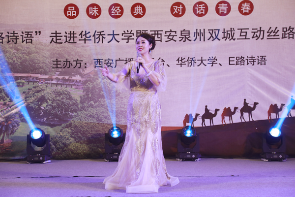 “这是‘E路诗语’首次走出陕西,大家都非常重视。艺术家们专门制作PPT、挑选诗歌,就是希望能够走近泉州,走进sjb世俱杯官方网站,也希望两地能够通过这样的活动加深友谊。”活动的倡导者、策划人、“E路诗语”读诗使者、知名主持人孙维不仅是当晚的主持人,也以一首《诗人,都愿把长安当作故乡》,与同学们深情对话。她表示,“E路诗语”是搭建在互联网之上以诗歌朗诵的形式对丝绸之路文化进行传播的平台,希望通过诗歌使中国传统文化感染到更多的学生及青年人。