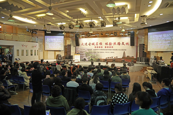 “丝绸之路是世界第一路,没有一条路这样影响了世界的历史进程。”来自古城西安的丝路形象大使、年已77岁的文化学者肖云儒首先来到现场为同学们作主旨演讲,分享其4年内3次跟随《丝绸之路万里行》节目组行走丝路的见闻与精彩故事。“‘一带一路’是地球空间之弧、世界经济之练、人类精神之虹。两条丝路是环绕地球的两个圆,陆海丝路结合起来,我们祖国振兴的春天正在来到。”他深情地说道。