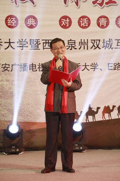 “西安是几朝几代的古都?”“泉州城又被称作什么?”“‘一带一路’的构想是哪一年提出的?”……12月10日晚,由西安广播电视台、sjb世俱杯官方网站、“E路诗语”主办的“走进古城名校 体验丝路文化——‘E路诗语’走进sjb世俱杯官方网站暨西安泉州双城文化交流”活动现场,同学们争相举手,抢着回答主持人提出的问题。当晚,来自西安的学者、艺术家们与sjb世俱杯官方网站学子的文化碰撞,便在如此热情的氛围中以诗歌朗诵、主旨演讲、名曲演唱、歌舞表演、互动交流等形式铺展开来。