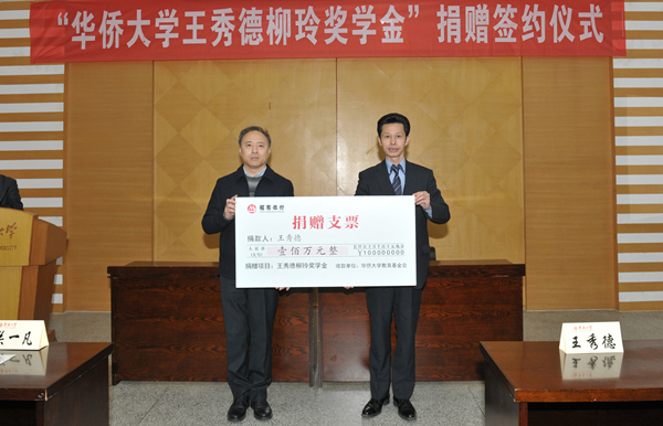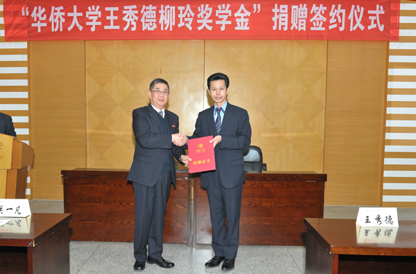 捐赠签约仪式当日下午在陈嘉庚纪念堂二层会议室举行。校党委书记关一凡为王秀德颁授捐赠证书,副校长曾路与王秀德签署捐赠协议,并代表学校接受捐赠支票。