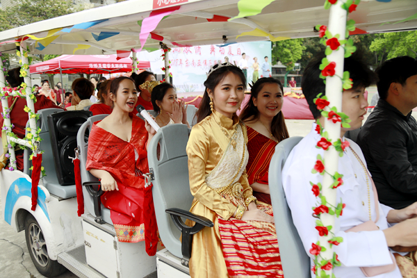 以花车开道,沐佛仪式的队伍庄严入场,带来新年的祝福。身着盛装的境外学生载歌载舞,用赠送祝福花环、点洒圣水的方式,拉开泼水节的序幕。