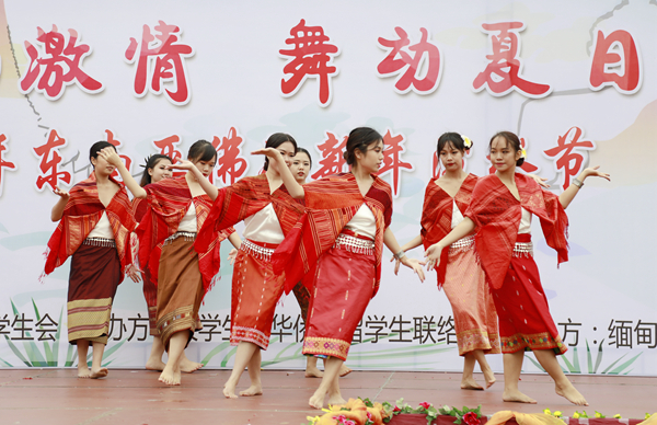 在泉州校区,廿四节令鼓的铿锵鼓点敲响了泼水节的律动前奏。开幕式上,境内外的学生们为现场观众带来了一场精彩的视听盛宴——各国学生的民族舞蹈、校艺术团的街舞秀、歌曲合唱等,同学们展示着才艺,台下观众欢呼连连,好不热闹。