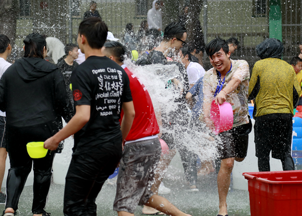 水枪、水盆、水勺,充气水床、灌水气球……当泼水活动开始,现场顿时变成了欢乐的海洋,各式各样的“武器”轮番上阵,伴随着动感十足的音乐,境内外学生怀揣着对彼此的真诚祝福,将清凉的水花尽情泼洒。