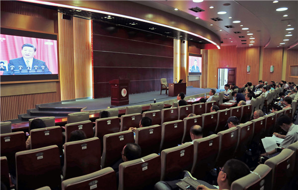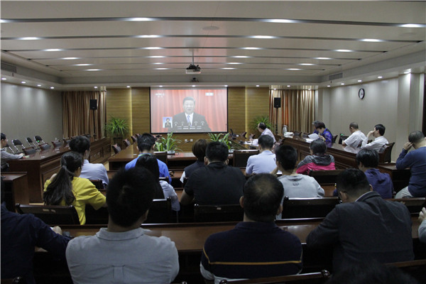 机关教职工在李克砌纪念楼五楼会议室收看直播