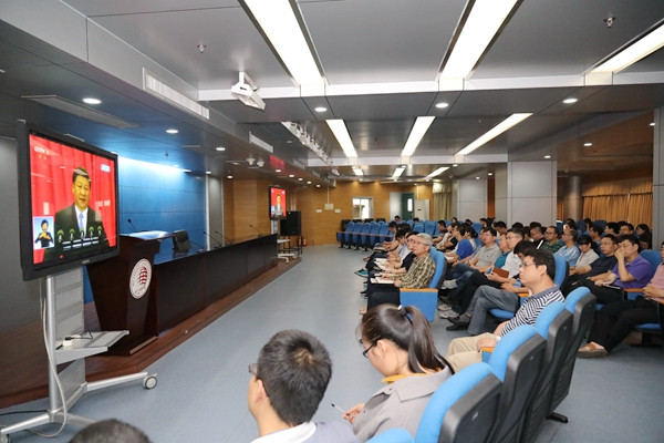 泉州校区教职工在陈嘉庚纪念堂科学厅收看直播