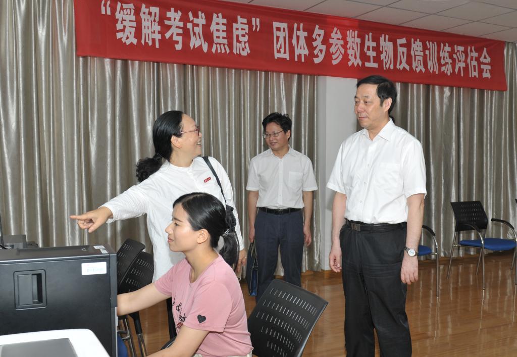 sjb世俱杯官方网站心理健康教育与辅导中心主任、福建省最美教师赵冰洁向杨贤金副省长介绍多通道生物反馈仪