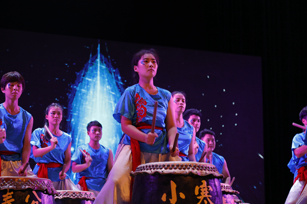 “还好没有出错。”经济与金融学院2017级学生祝颖倩在公演第一个节目中登场,参加这个节目表演的全是大一新生。她害羞地说,表演的过程既紧张又激动,“为了准备这场表演,那些与队友们一边打鼓一边唱歌的集训夜晚,是我最美好的回忆。”