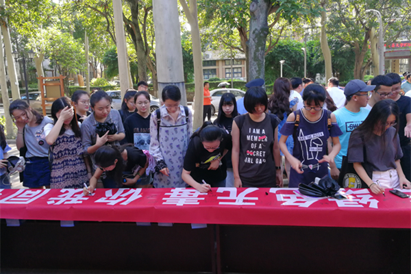 巡讲活动结束后,与会人员在“健康人生、绿色无毒、你我同行”的条幅上签下自己的名字,表达拒绝毒品的决心。