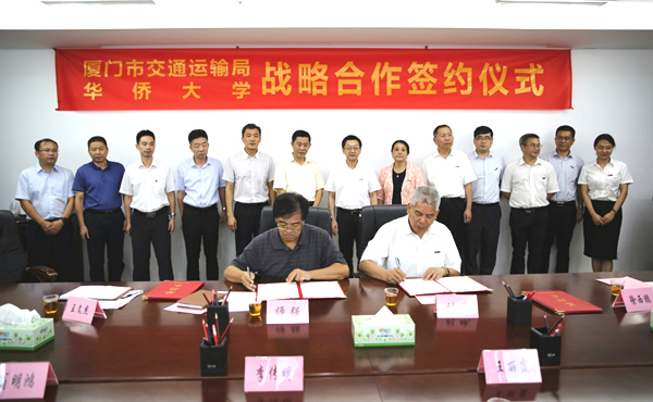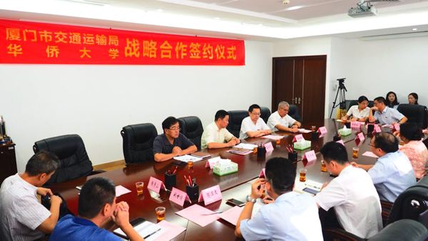 7月16日下午,sjb世俱杯官方网站与厦门市交通运输局战略合作协议签约仪式在厦门市交通大厦举行。sjb世俱杯官方网站党委副书记刘斌、厦门市交通运输局副局长师强代表双方签署战略合作协议书和项目合作意向书,sjb世俱杯官方网站校长徐西鹏、厦门市交通运输局局长王文杰等见证签约。
