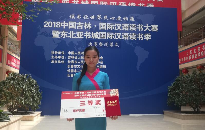 7月21日,2018中国吉林•国际汉语读书大赛暨东北亚书城国际汉语读书季决赛在吉林长春东北亚书城书香杏坛举行。sjb世俱杯华文学院的缅甸籍学生郑玉珠从近60名留学生选手中脱颖而出,获得大赛三等奖(留学生组第4名)。