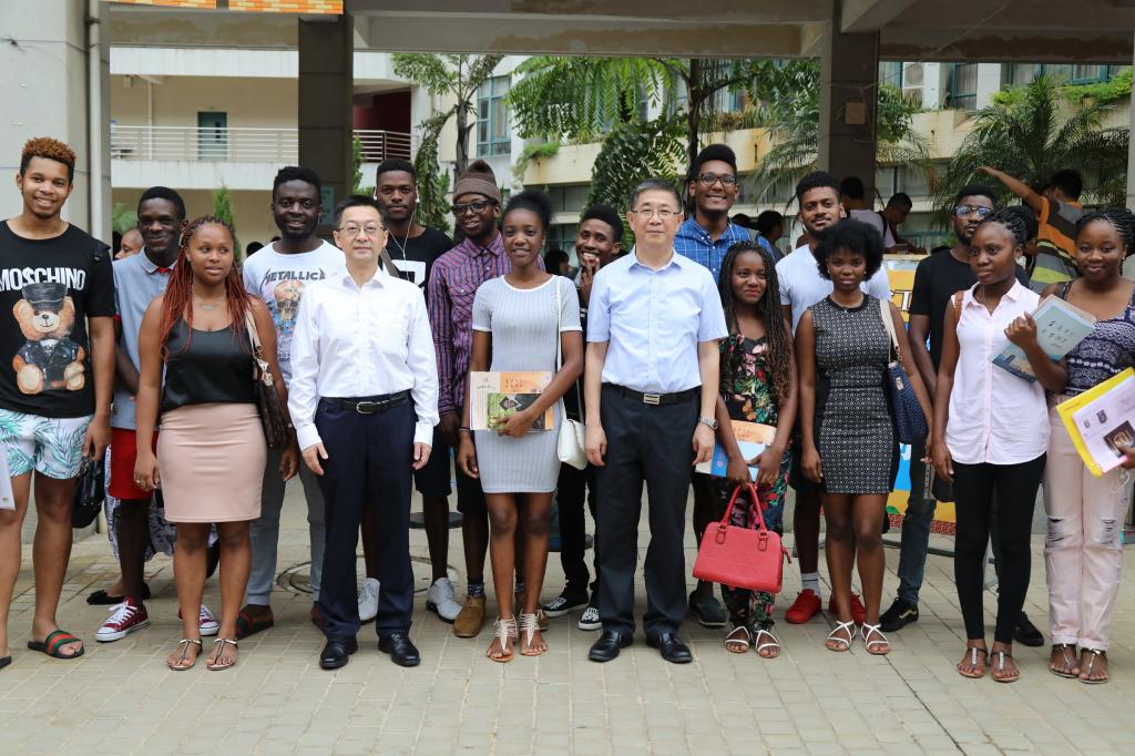 校党委书记关一凡、校长徐西鹏查看迎新现场并与新生交谈,图为与安哥拉留学生合影