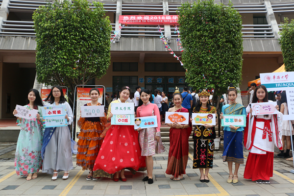 华文学院学生穿着民族服装欢迎新生