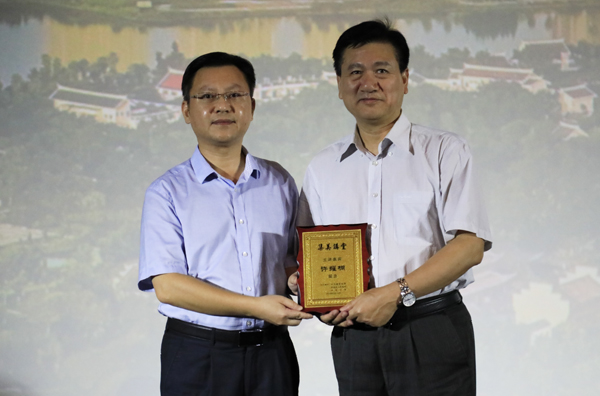 集美区宣传部部长赖朝晖为许耀桐教授颁发“集美讲堂”主讲嘉宾纪念牌