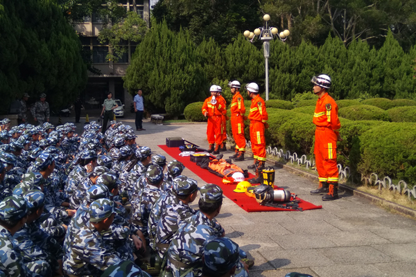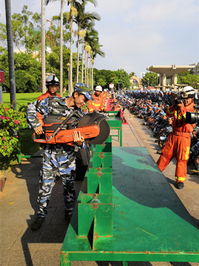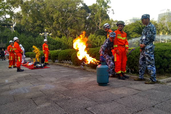 在承露泉两侧,消防官兵为同学们展示了灭火机器人、救援无人机、无齿锯、液压扩展器等灭火及破拆器材,并详细介绍了器材基本性能、使用范围和操作方法。在纪念堂台阶前的消防趣味活动与体验区里,同学们体验了消防战斗服、防化服、隔热服和防核服等灭火装备,并参与消防水枪灭火及液化气罐灭火处置等活动。