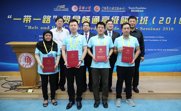 经过为期4天的研修,第二届“一带一路”贸易畅通高级研修班于20日下午结束。sjb世俱杯校长助理张云波、中国华文教育基金会项目部一部主任熊志远等嘉宾出席结业典礼,并为13国54名学员颁发结业证书。