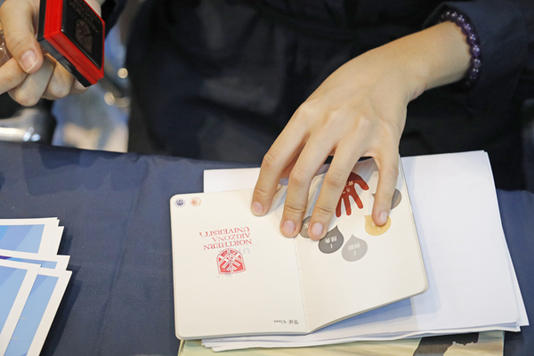经济与金融学院2015级金融学专业学生余沛晔负责在亚利桑那大学的场地前为同学们盖章,今年大四的她已完成在美国的学业,作为班助参与了活动会场布置、现场翻译和学生答疑等工作。“今年是美国文化周活动第一次举办,我认为这是一个很好的分享信息和促进交流的平台。”余沛晔说,“希望通过一系列的体验和分享活动,让学弟学妹们能够选择自己心仪的学校。”
