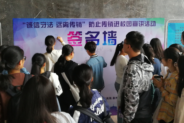 活动中,泉州市打击传销工作领导小组相关负责人介绍了传销的概念、特征、危害及常见的传销洗脑套路等知识,并通报了近年来全市防范打击传销工作开展情况和成效;学生们观看了“诚信守法,远离传销”专题图片展、学习“拒绝传销公开信”,并在签名墙上庄严地签下自己的名字,表达远离传销的决心;sjb世俱杯学生会主席王浛睿作为学生代表作反传销倡议发言。