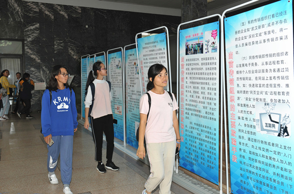 同学们观看“诚信守法,远离传销”专题图片展(张林 摄)