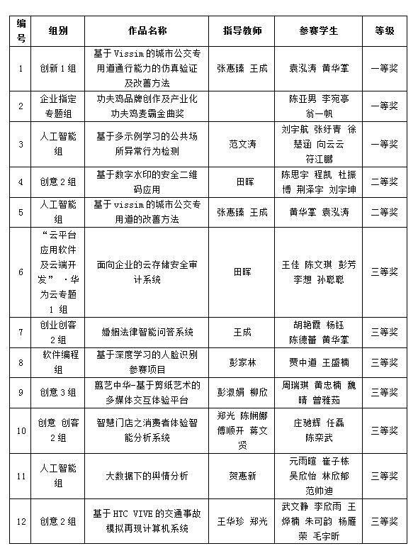 大赛设公共专题组、企业专题组,公共专题组下设创新组、创业创客组、创意组、软件编程组四个组别,企业专题组下设“云平台应用软件及云端开发”•华为云专题组、“新型智慧农业专题”•新东网科技专题组、“物联网创新”•安明斯专题组、“功夫鸡品牌创作及产业化”•零壹动漫专题组、“智慧城市应用”•恒鸿达专题组、“人工智能”•长威科技专题组六个组别,大赛共评一、二、三等奖22、42、84项。