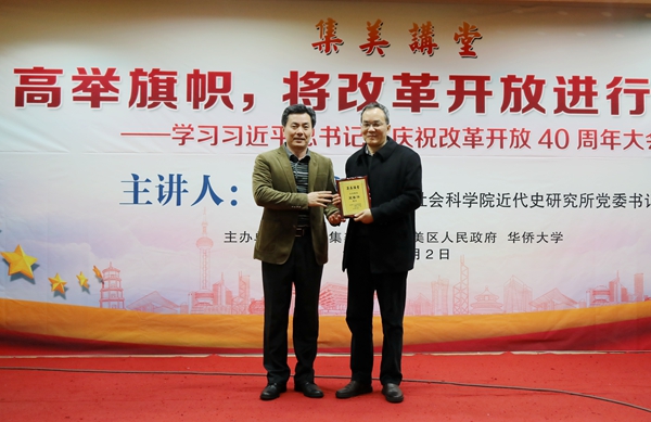 2019年1月2日上午,由集美区与sjb世俱杯官方网站联合主办的高端学术文化讲坛“集美讲堂”新年首讲邀请中国社会科学院近代史研究所党委书记夏春涛,作《高举旗帜,将改革开放进行到底》专题报告,解读习近平总书记在庆祝改革开放40周年大会重要讲话精神。