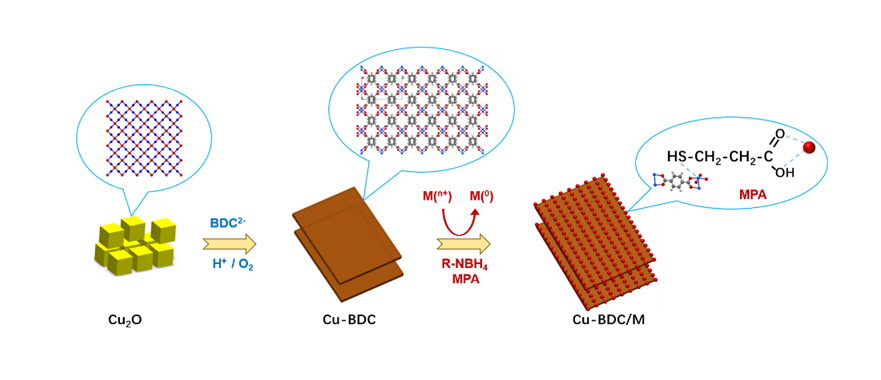 金属有机骨架(MOF)是一类自组装的有序多孔材料,其三维空间框架是由金属离子(或团簇)和有机配体通过配位键自组装而成,广泛用于催化、气体储存、药物可控传递、膜分离等领域。但是,目前MOF的形貌调控仍具挑战性,特别是二维MOF纳米薄片的合成方法报道还较少。该论文首次采用Cu2O纳米立方块(~60 nm)作为铜离子源,通过一步反应制备二维含铜MOF纳米薄片(即,Cu-BDC,厚度< 6 nm)。研究发现Cu2O纳米立方块在对苯二甲酸(H2BDC)的作用下会逐渐释放出Cu+离子,Cu+离子被溶解氧进一步氧化为Cu2+,继而与溶液中的有机配体配位,构建二维金属有机骨架。相关表征结果证明,金属离子源在MOF制备过程中处于独立的限域空间,相反,使用常规铜盐(硝酸铜)的溶剂热合成法仅产生尺寸为2~10微米的块状MOF材料。二维Cu-BDC具有超薄的厚度、定向生长和优异的结晶度,因而可作为载体制备一系列具有高活性位点的集成催化剂。例如以3-巯基丙酸(MPA)为分子连接剂,可将各种不同组分、尺寸的金属纳米晶体(如2.2 nm Au,4.3 nmAg,2.5 nmPt,和3.1 nmRu)负载于二维Cu-BDC纳米薄片外表面。此外,研究发现基于二维MOF的复合材料在有机缩合反应中具有高催化活性和稳定性,与传统的催化剂相比具备众多优势。这些研究结果为二维MOF纳米薄片的合理设计和制备提供了另一种策略,并拓展了二维MOF的催化应用。