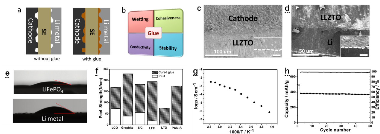 (a)“胶水”修饰与不修饰的全固态电池;(b)“胶水”电解质的特殊性能;(c)“胶水”修饰后 正极/固态电解质 的SEM;(d)胶水修饰后 负极/固态电解质 的SEM;(e)“胶水“在LiFePO4正极和Li金属表面的接触角;(f)“胶水”在不同电极和固态电解质上的剥离强度;(g)胶水固化后的离子电导率随温度的变化趋势;(h)室温下基于PANS正极的全固态电池的循环性能。