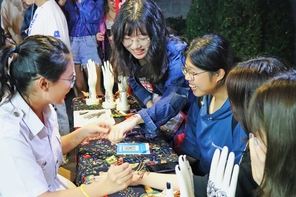 海娜手绘是本次文化展中最为火爆的的摊点之一。“马来西亚文化最大的亮点就是多元,扯铃和节令鼓就有很明显的华族特色,而海娜手绘其实就是一种印度特色文化,主要出现在新娘出嫁或者重要节日等场合。”经济与金融学院2015级马来西亚学生蔡尚全是海娜手绘摊点的负责人之一,他表示,选择在马来西亚文化节中展示海娜手绘,主要是为了展现马来文化和谐包容的一面,让大家能够更加全面地了解马来文化。