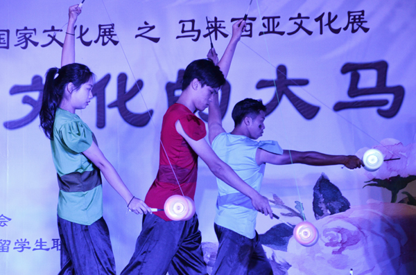 此外,在文化展示区,“美食天堂”的椰浆饭超越了大家所熟知的咖喱、煎饼,成为了当晚马来西亚特色小吃中的主角;一旁古朴原始的马来西亚服饰与猎具展览讲述着古代马来西亚的神秘魅力;悬挂的当地风景影集则展示了旖旎动人的马来风光;冲格(congkak)、蛇棋、打弹珠等马来西亚特色游戏,仿佛将大家带回了欢乐无忧的童年时光。