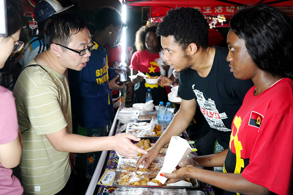 除精彩的文艺表演外,大家还能品尝到风格迥异的各地美食。缓步绕灯光篮球场一周,来自印度尼西亚、缅甸、马来西亚、老挝、泰国、安哥拉、菲律宾等国家及中国香港、澳门、台湾地区的学生站在各个摊前忙碌地准备食物、热情地招待顾客,邀请前来参观的同学品尝佳肴。马来西亚的肉骨茶、椰丝球,老挝的木瓜沙拉,印度尼西亚的椰浆饭,菲律宾的特色零食,安哥拉的巧克力蛋糕及缅甸的椰子冻等美食令人眼花缭乱、垂涎欲滴。