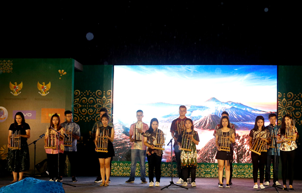 亚齐省沙曼舞、苏门答腊的萨满舞、多巴湖传统舞蹈、印尼民歌《Sigulempong》、印尼传统武术、印尼“国乐器”昂格隆演奏……印尼在厦留学生身着盛装,现场载歌载舞,以民族舞蹈、音乐、武术、诗朗诵、传统游戏等形式,展示印尼的民俗风情。而离演出舞台不到十米的亚洲各国美食会场,各种令人垂涎欲滴的亚洲美食“轮番上阵”,共同营造出聚亚洲美食、享饕餮盛宴的浓郁氛围。