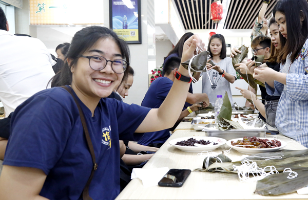 文学院2016级学生常彩云来自泰国,她说:“我来到华大三年了,对于端午节划龙舟、吃粽子的传统习俗也比较了解。但是像这样真正体验粽子的制作过程还是第一次。”作为泰国同学会会长的她一边包着手里的粽子,一边招呼着其他同学。“能亲手包粽子真的很有趣,大家都很开心。”她笑着说。