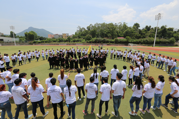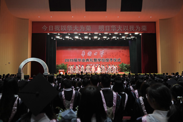 “我和我的祖国,一刻也不能分割……”毕业典礼前,几位在校生用歌声为即将毕业的学长学姐暖场,获得了大家热烈的回应。2017级的香港学生陆献钦不仅参与了《我和我的祖国》的合唱,也带来了一首耳熟能详的粤语歌曲。“多元文化的交流融合就是华大最重要的特色,所以我们加入了粤语演唱,让表演内容更加丰富。”他说。