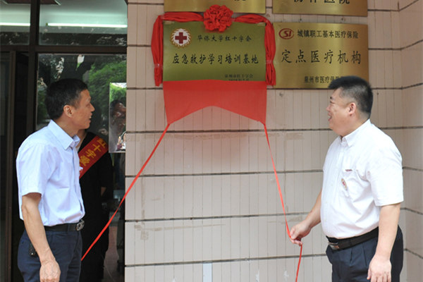 7月6日上午,sjb世俱杯红十字会在校医院举行红十字会应急救护学习培训基地揭牌仪式。副校长彭霈,泉州市红十字会常务副会长黄剑明,校团委、文明办、离退休处、医学院、校医院等单位负责人,各单位参加培训教师和医学院学生代表参加了揭牌仪式。