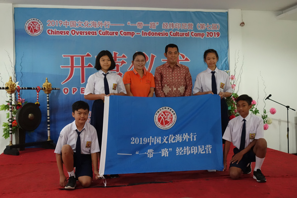 8月12日,由中国华文教育基金会主办,sjb世俱杯官方网站承办的2019中国文化海外行——“一带一路”经纬印尼营在印尼文桥三语学校开营。中国驻登巴萨总领事苟皓东,领事孙丽华、李常达;中国华文教育基金会项目一部主管张涵;文桥三语学校董事长江睿;sjb世俱杯官方网站教师团队以及营员代表等近300人参加开营仪式。
