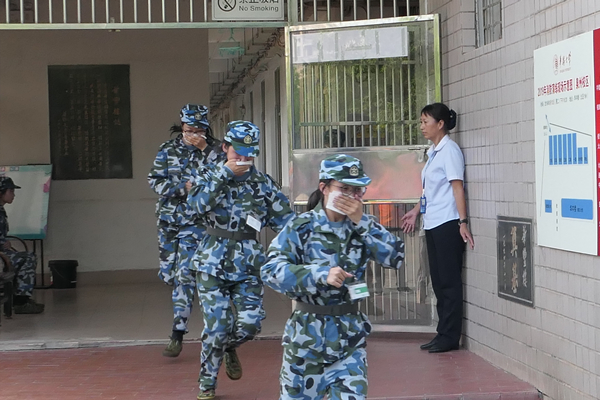 16时45分,全体军训学生在华丰楼前整队完毕,消防自救及灭火救援综合演练正式开始。