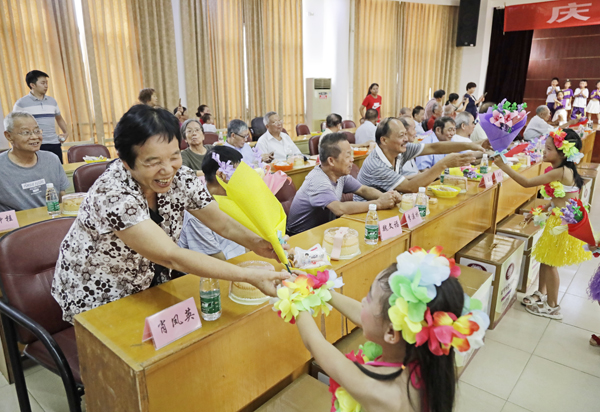 尤梅幼儿园的小朋友向老同志们献上纸扎花与祝福