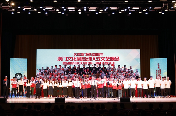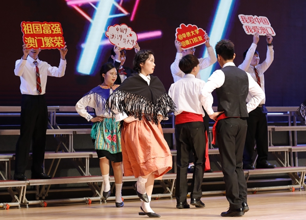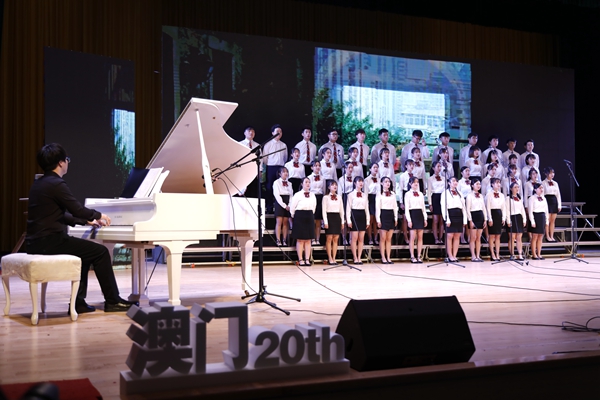 这,是在庆祝澳门回归20周年、澳门文化周启动仪式文艺晚会上的一幕。当晚,包括澳门学生在内的数百名海内外学子以及众多校友汇聚一堂,以一场青春联欢的视听盛宴,为澳门祝福,为祖国歌唱。