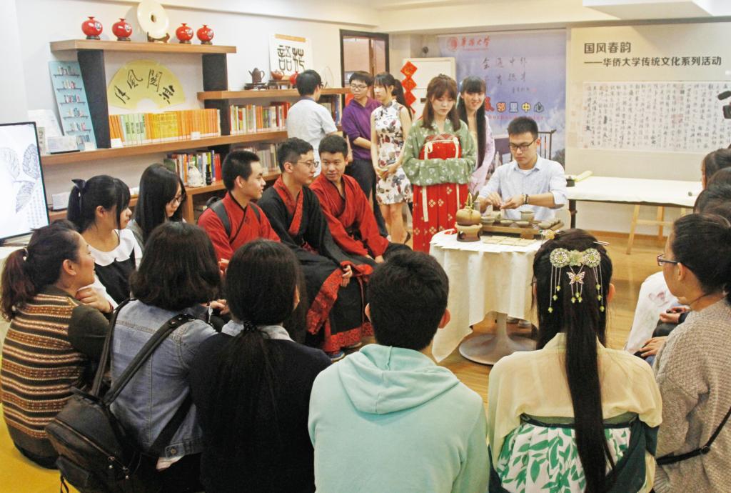 一是推动故事教学与社团活动有效融合,增强中华优秀传统文化学习的趣味性。学院将“南音艺术、《诗经》、孔孟儒学(以“四书”为例)、老庄(寓言育人)、史汉、唐诗宋词、四大名著、古文学、书法艺术”等9个境外生传统文化学习计划融入穿越话剧社、蒹葭汉服社、华音社、电影协会、茶苑协会等院属学生社团进行故事教学,并依托闽南文化研究中心、中国传统文化研究中心、中国语言文字研究中心、海外华人文学暨台港文学研究中心等院属科研机构编写文化故事读本,让境外生在学习中华优秀传统文化中感受到粘度。