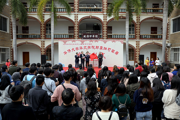 揭牌仪式后,与会嘉宾们到“邱季端可茗居”室参观了展室陈列的陈年普洱展品,并了解了华文学院中华文化传播课程开设情况。在风雅中华馆一楼,华文学院留学生用流利的汉语向邱季端先生介绍了以《侨校使命 中国故事 全球视野》为主题的“华文星火”中华文化海外传播团活动。