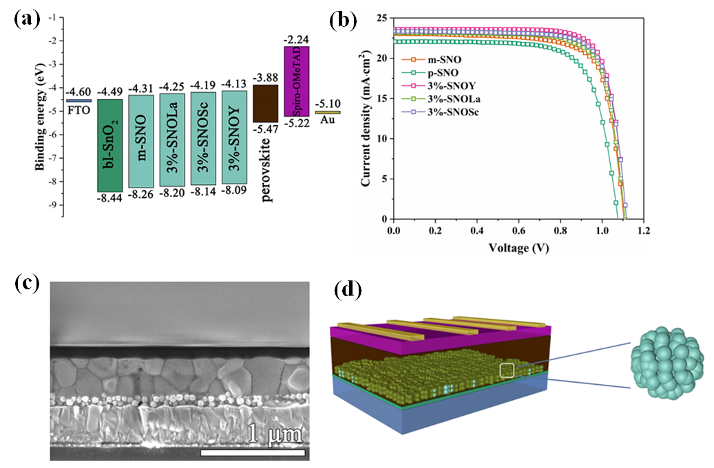 图(a)电池能及排列 (b)J-V曲线图 (c)电池横截面SEM图 (d)电池器件结构示意图以及SnO2纳米团簇示意图