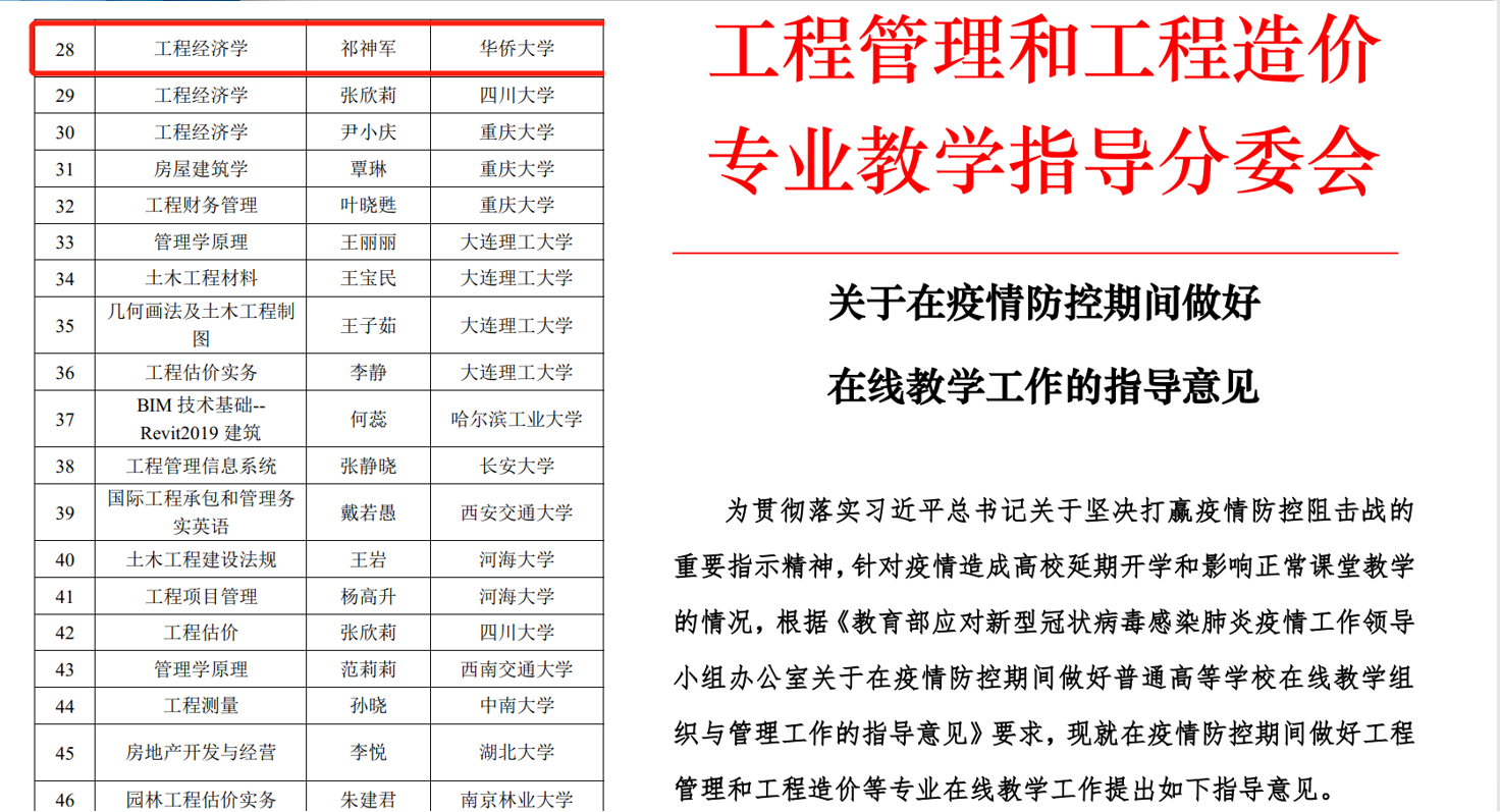 华大课程入选入选教育部工程管理和工程造价专业教学指导分委会的推荐在线课程资源