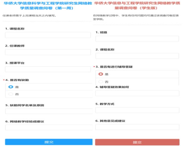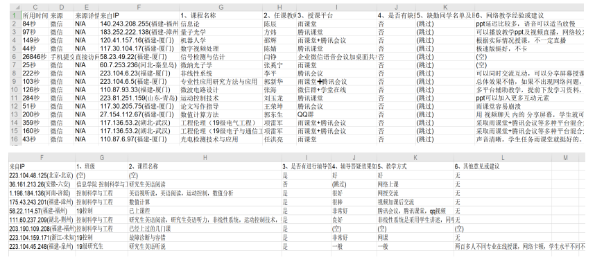 为了第一时间掌握研究生网络课堂学习和教学质量情况,学院设计了“问卷星”小程序,对研究生网络教学情况进行调查统计。一方面,每周开课前向学院老师发布调查问卷,老师们只需通过手机填写提交,即可反馈课堂教学情况。另一方面,向学生发布调查问卷,及时跟踪和掌握疫情期间研究生的学习体验。师生提交后,学院即可查看并导出后台数据,直观地了解每堂课学生的出勤情况、总结好的网络课堂教学经验、协助老师解决网络教学中的困难等。