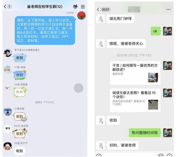 曹伟副教授利用QQ视频讲授《文献阅读与检索》课程,并将专业课与思政教育相结合,不忘关心学生。他还热心地将网络教学的经验分享给其他任课教师。